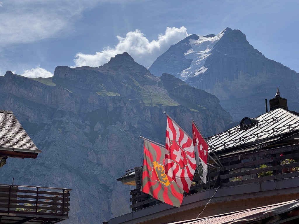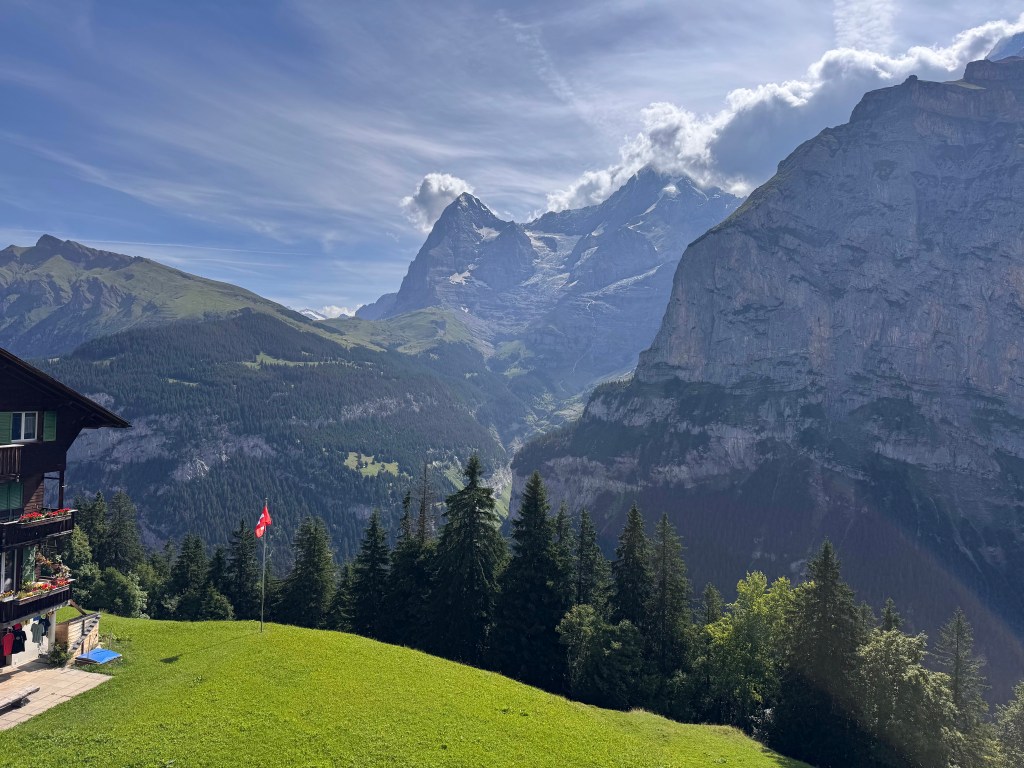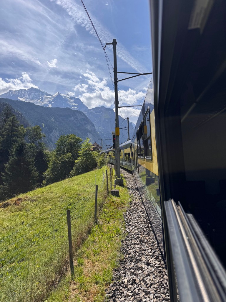 From Mürren, we took the train to Grütschalp, the cable car down to Lauterbrunnen, and then the train that would carry us out of the valley. The sun was bright, clouds trailing across the jagged peaks.