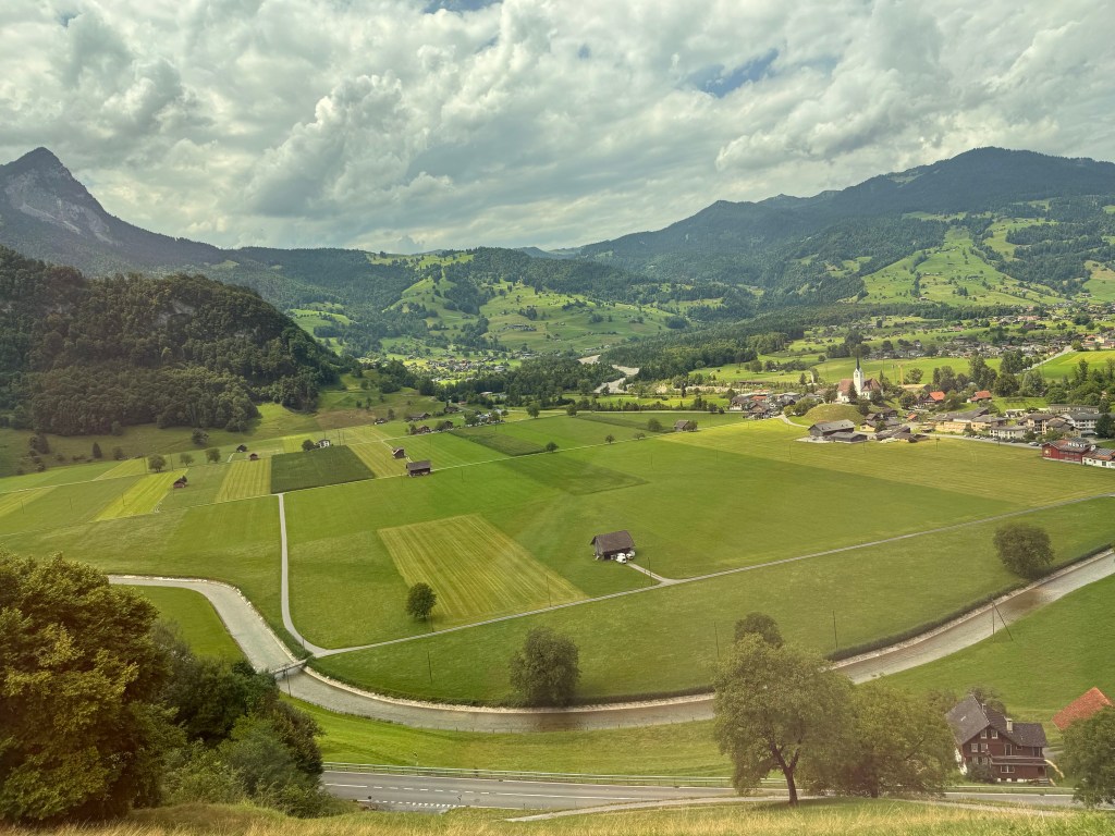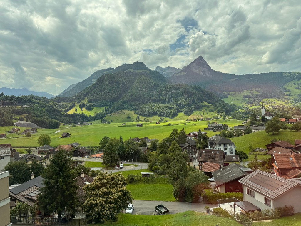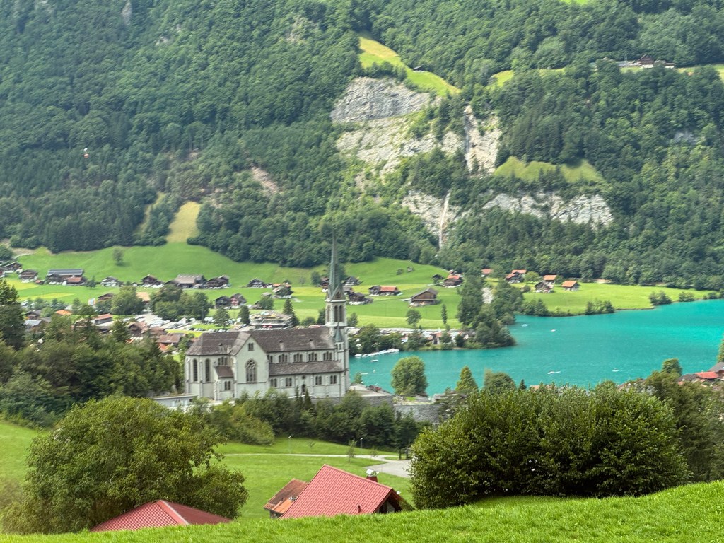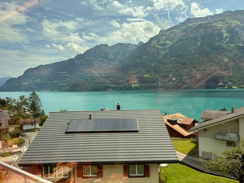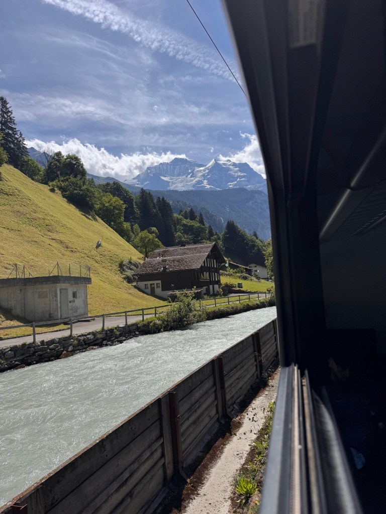 We changed trains in Interlaken, riding in style with views of Lake Brienz’s emerald water gleaming in the sun. The train took us through mountain passes, along rivers, past small towns nestled up next to lakes and green pastures.